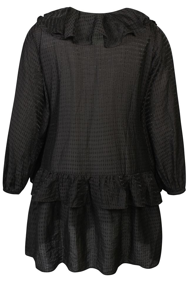 - Moneen menoon musta A-linjainen mekko, johon leveä kaulus antaa ilmettä ja juhlavuutta