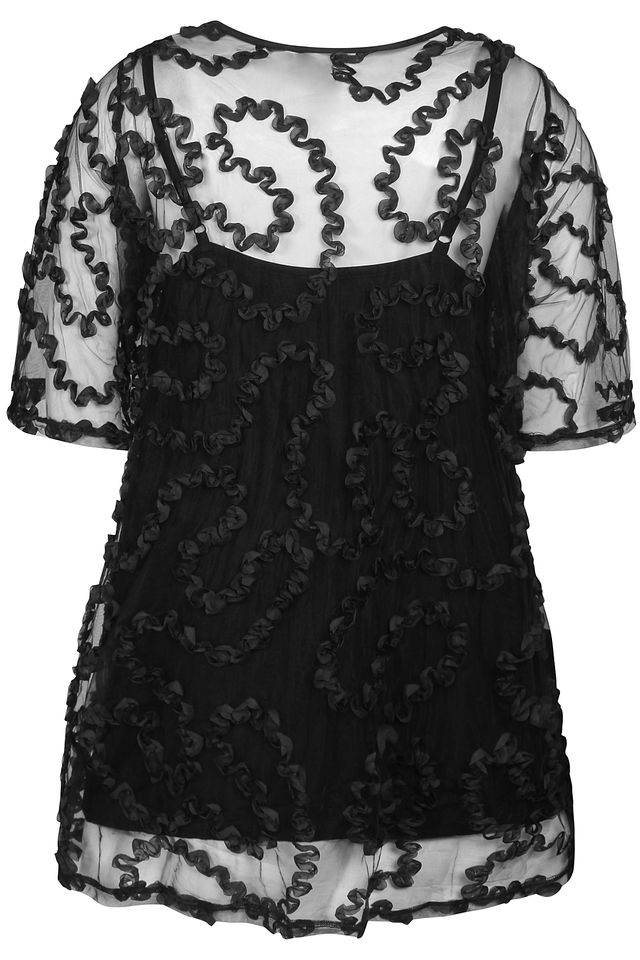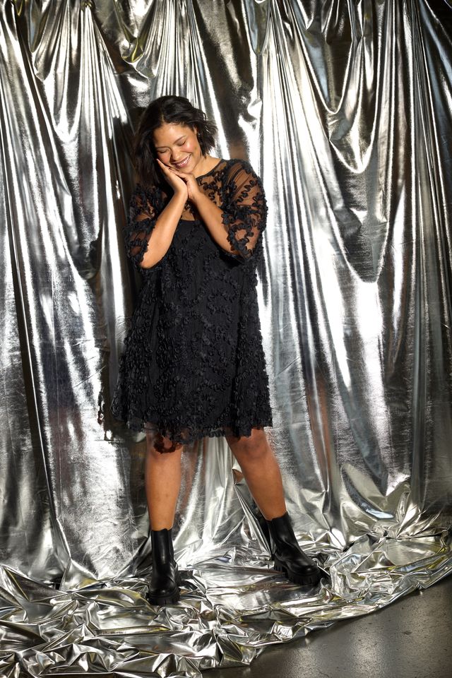 - Päällyskankaaseen on ommeltu tehostekoristeita tuomaan ilmettä mekkoon