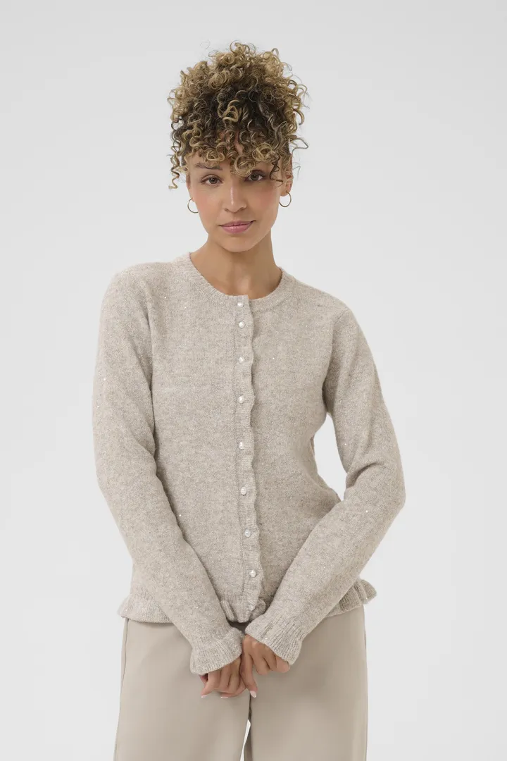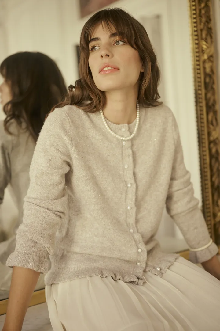 • Todella kaunis ja naisellinen vaalean beigen värinen neuletakki, josta löytyy hieman blingiä metallilankojen sekä pienien paljettien vuoksi