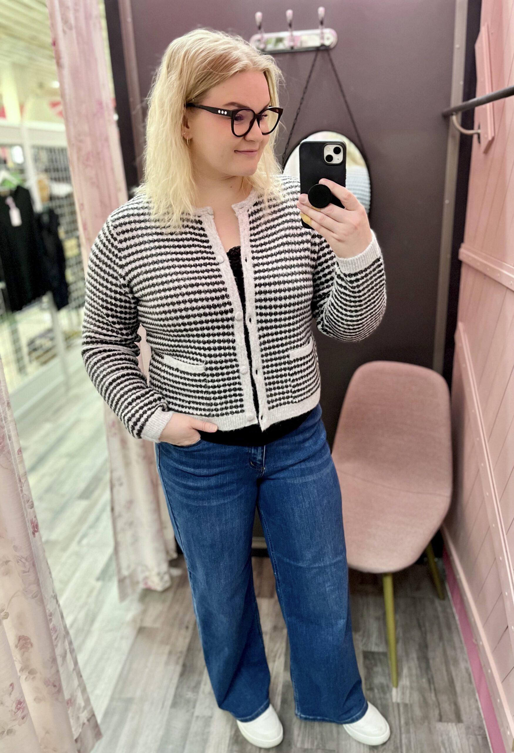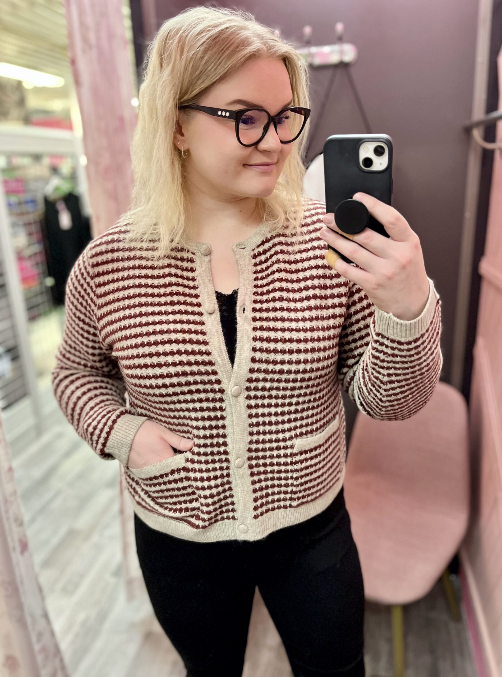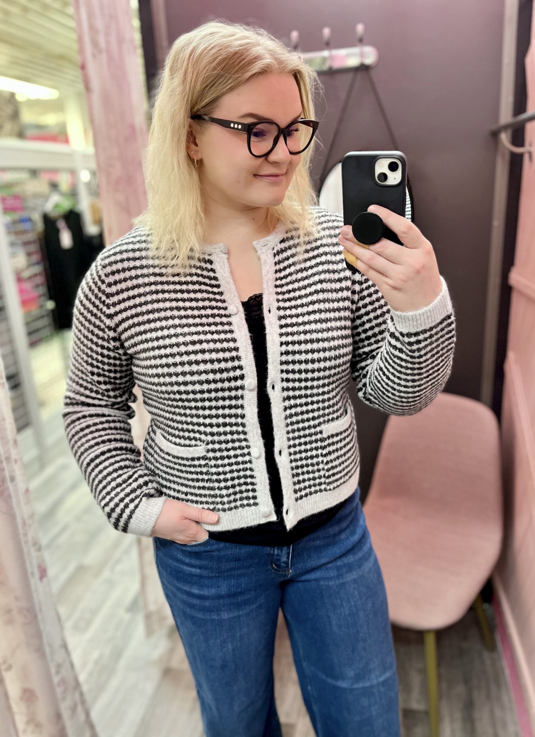 - Kuviollinen neuletakki, jossa on hyvä pituus hameiden ja housujen kaveriksi