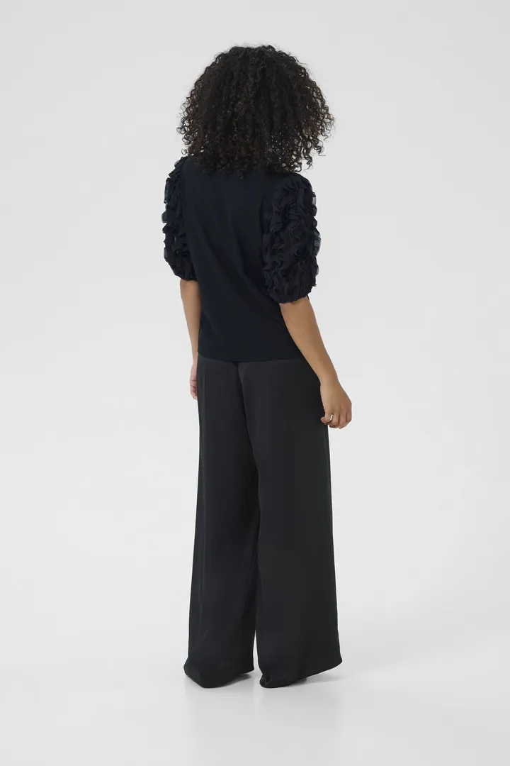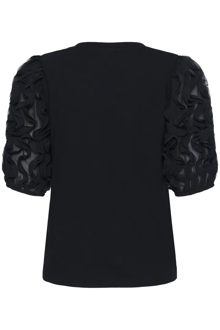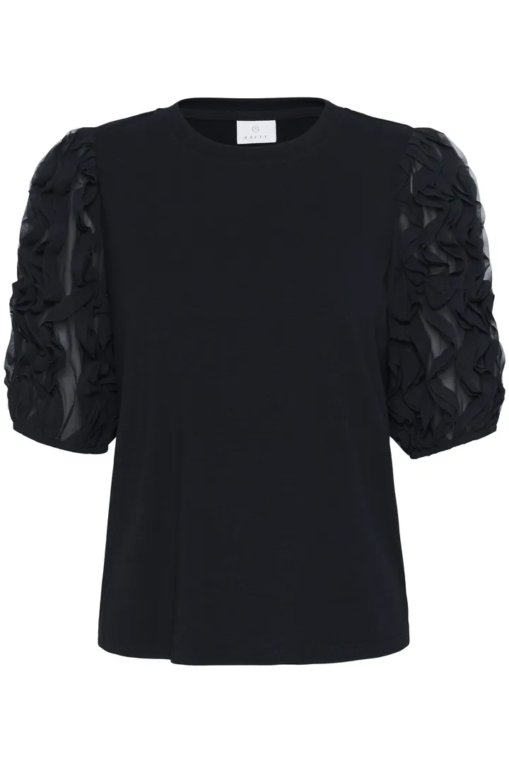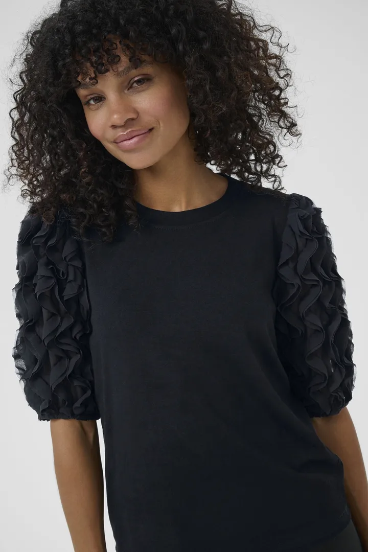 - Ihana ja persoonallinen T-paita röyhelöhihoilla, joka menee hyvin moneen menoon sekä monenlaisien alaosien kanssa
