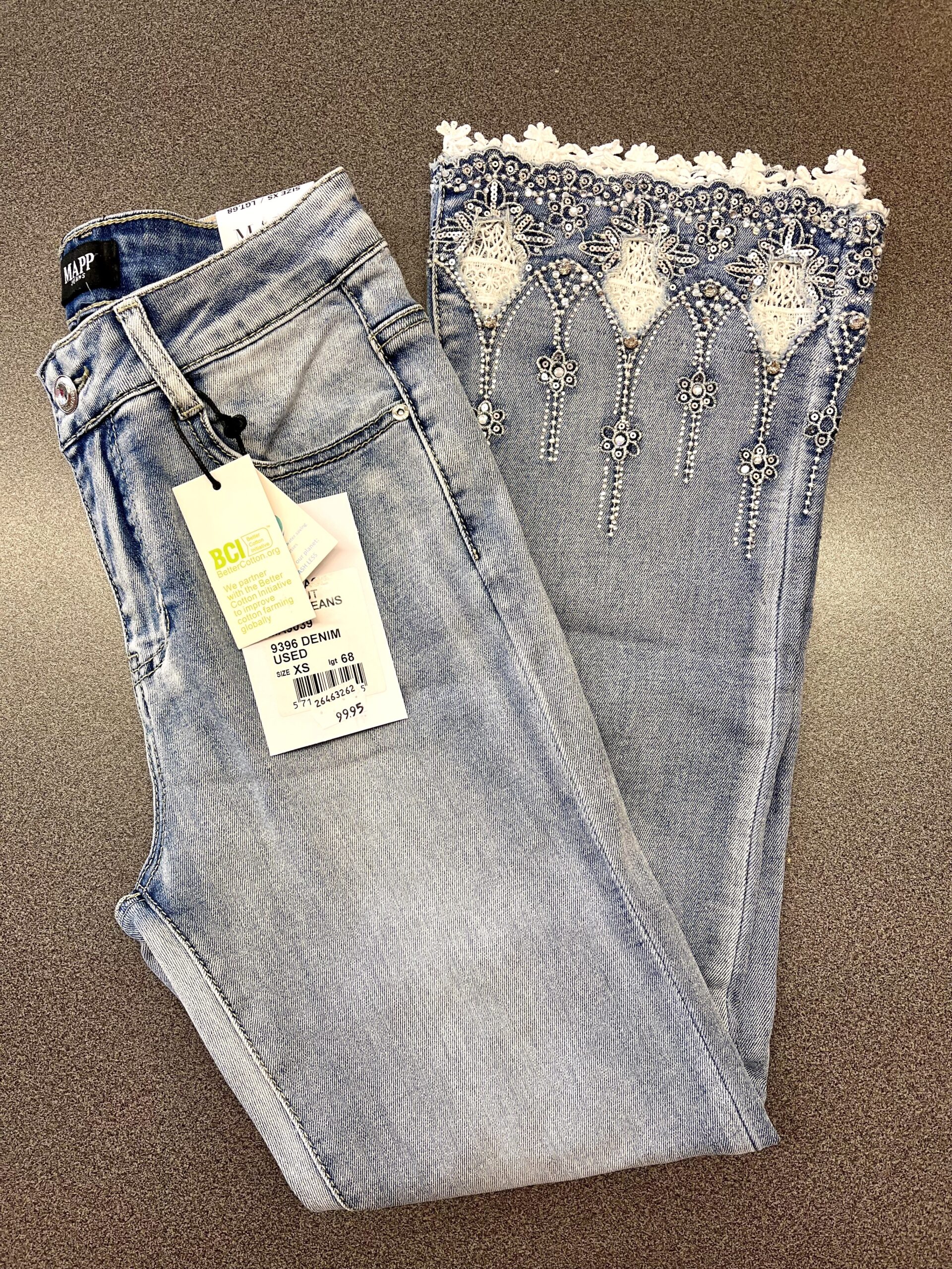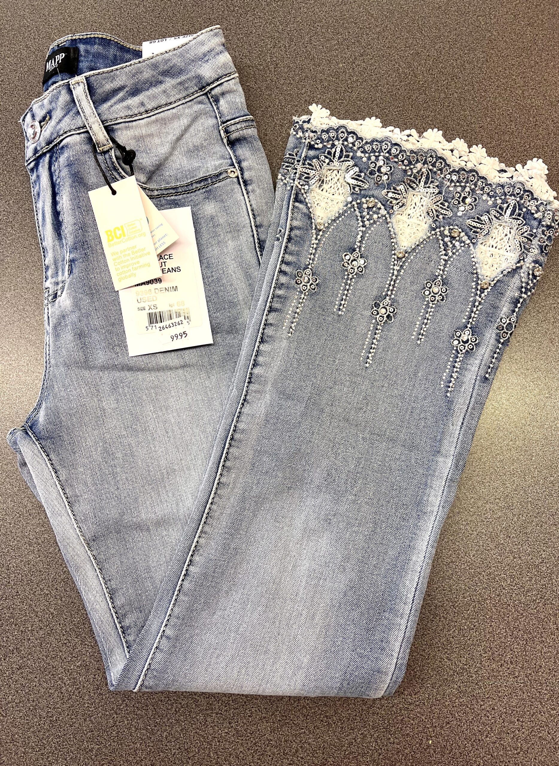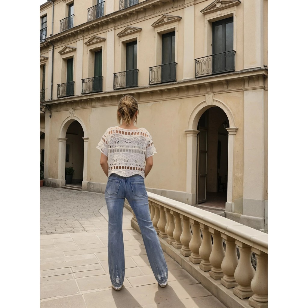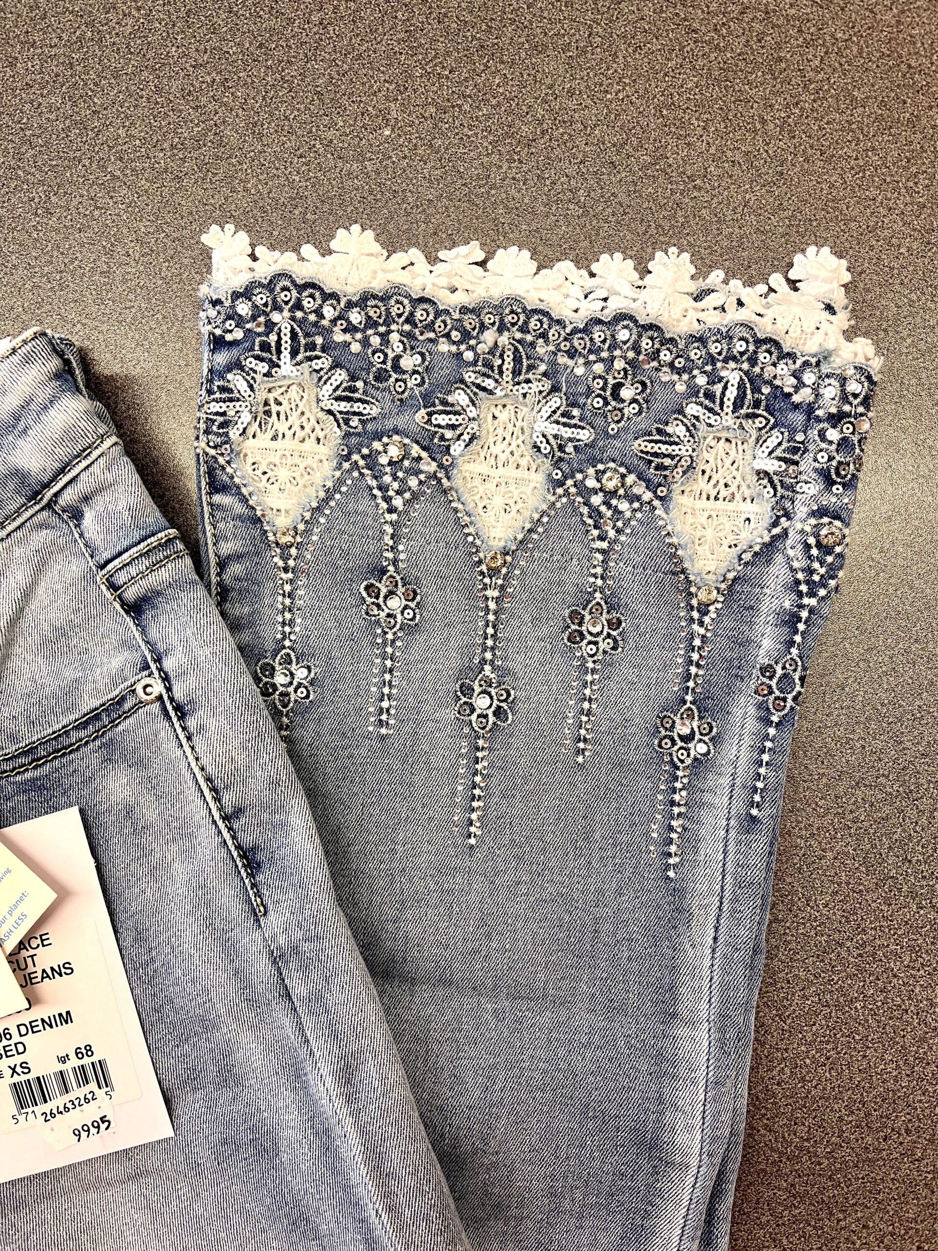 - Ihanat pitsi- ja strassikoristeiset, naiselliset bootcut-farkut kesäiseen menoon, hänelle joka haluaa farkkuihin hieman erikoisuutta