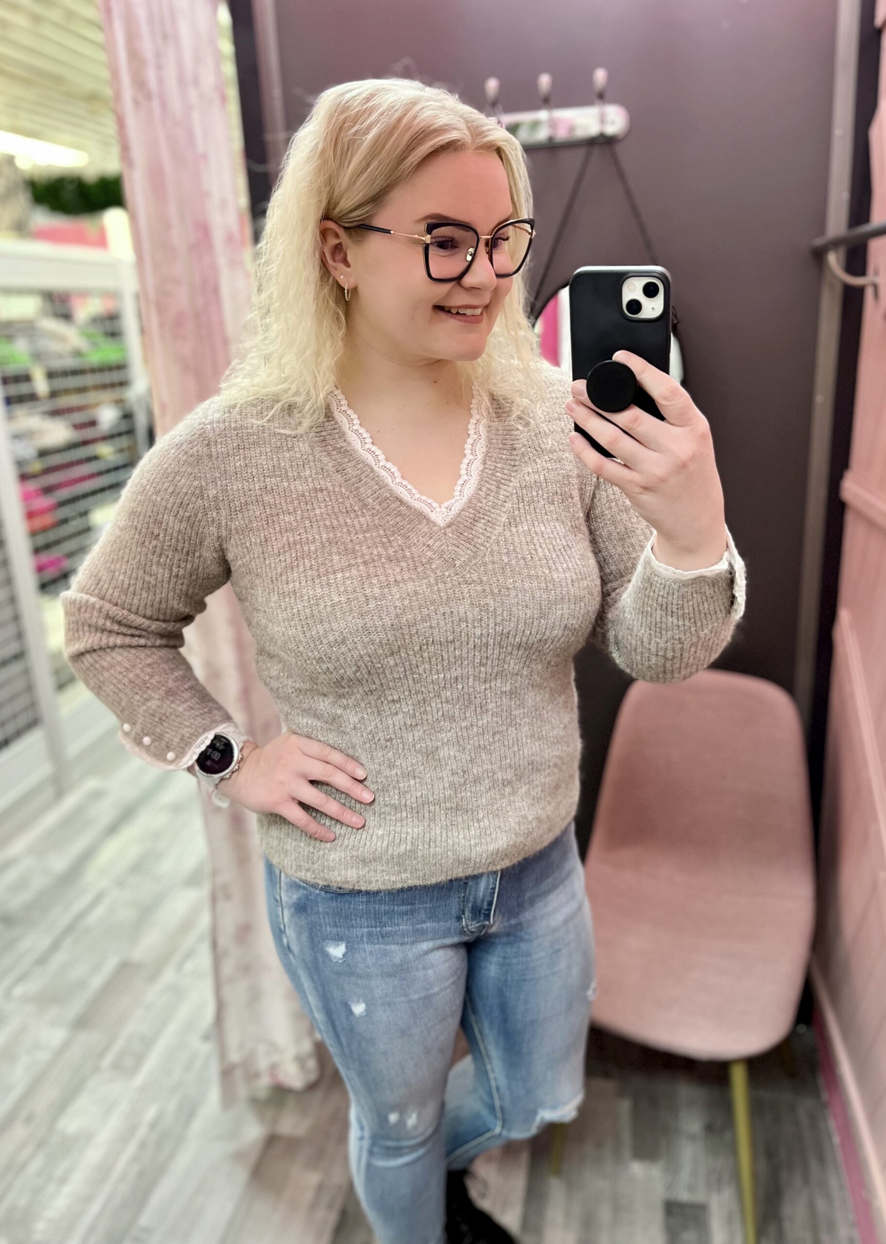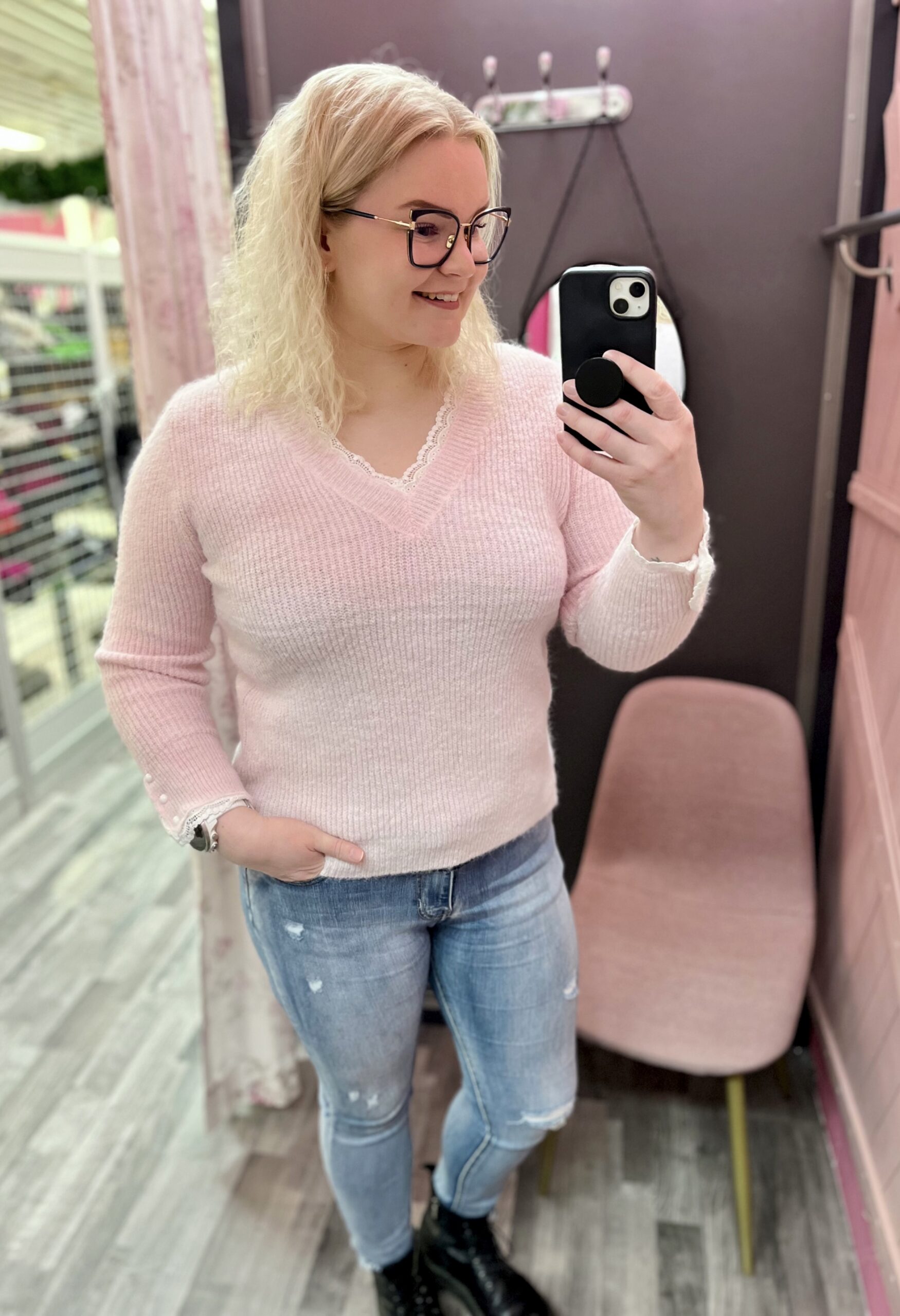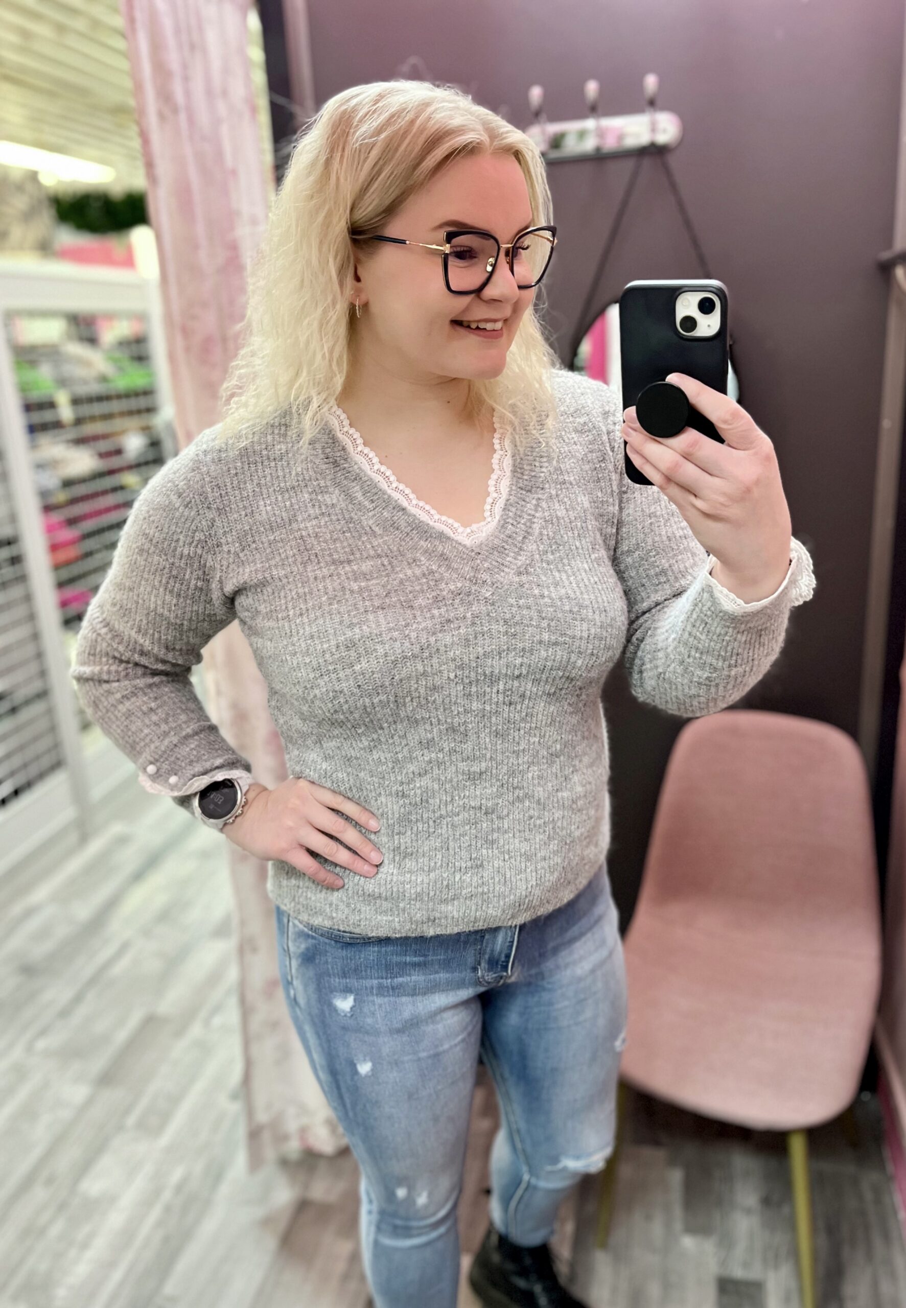 - Kivasti uudenlainen ja naisellinen neulepusero, jossa kaulusta ja hihojen suita koristaa kapea pitsi