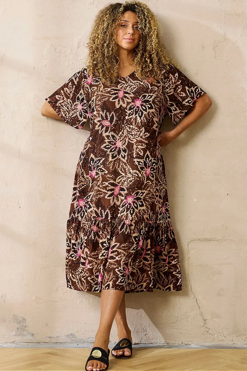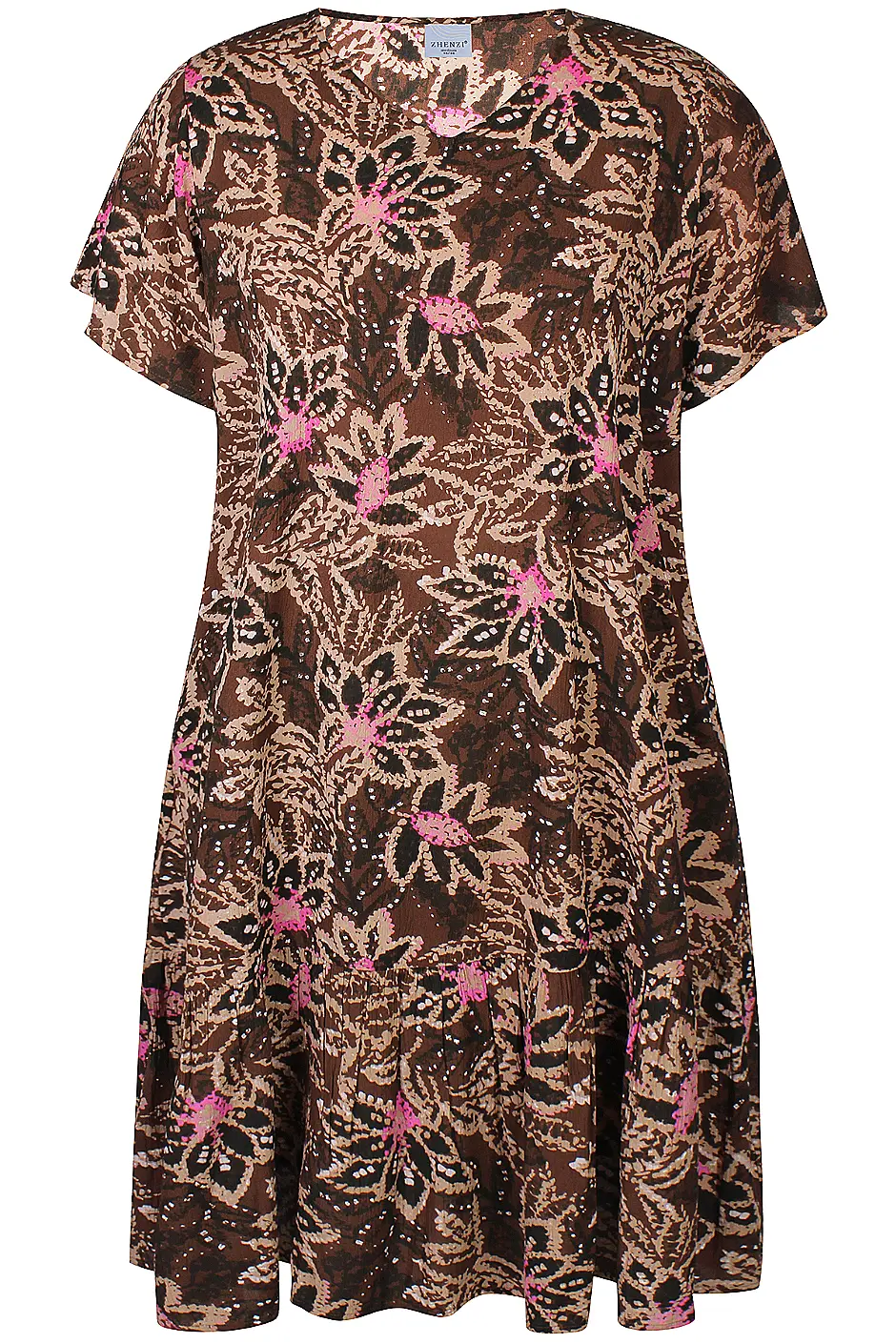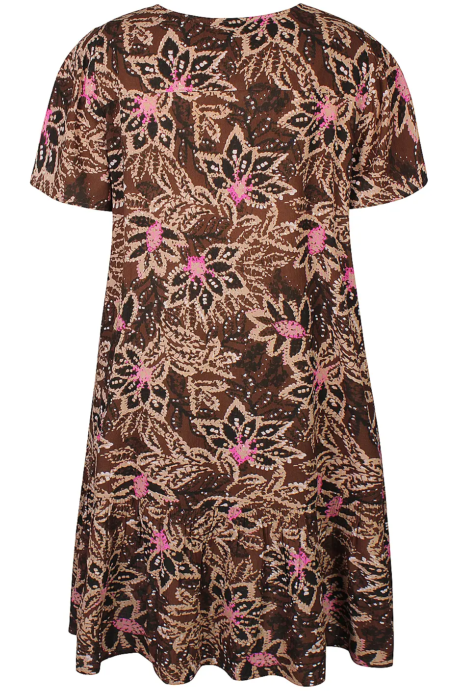 - Kaunis suklaanruskea pohjasävy, vaaleanhiekan sävyiset kuviot pinkeillä ja valkoisilla tehosteilla